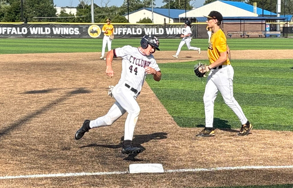 Andrew Schmieder of OOTP Cyclones Prospects rounds third to score on single by Lucas Gabriel.