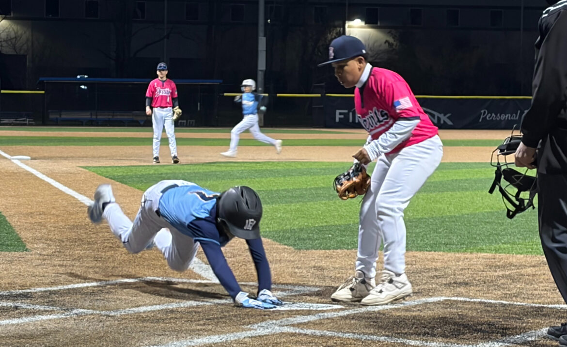Nick Simone dives into home plate to score on a wild pitch for House of Thunder 14U.