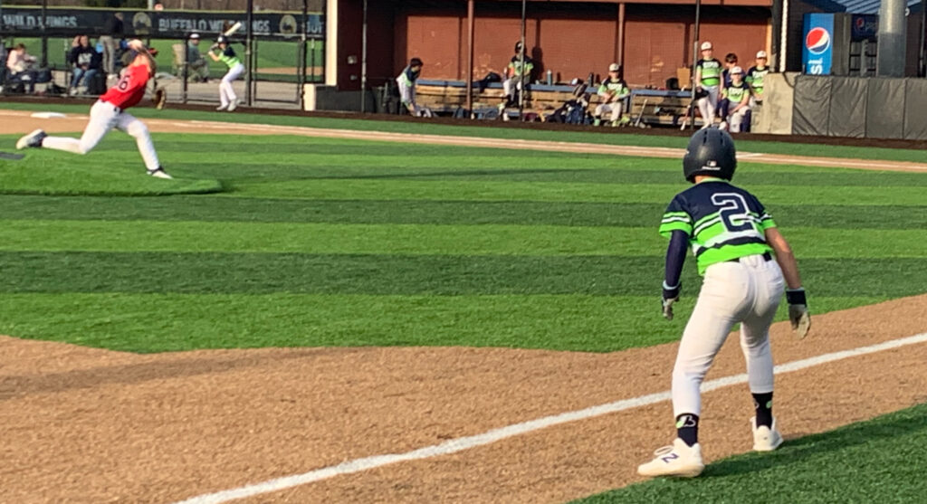 Aidan Finizio of the Expos leads off third as Gregory Brown delivers for Hustle Baseball.